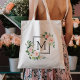 This monogram tote bag features painted watercolor flowers in blush pink, white, and green foliage with square frames. For more advanced customization of this design, Please click the "Customize" button.