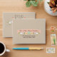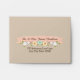 Add your names and address to this pretty custom rustic floral boho style RSVP return envelope with a khaki sand colored background and printed blush peachy pink ribbon look banner with a white cherry blossom branch, sunflower, brown eyed susan and aqua teal blue wild rose tulip and posy laurel wreath design. These envelopes perfectly compliment a bohemian chic, country western, farm, farmhouse, barn, barnyard or outdoor garden themed special occasion like a wedding, bridal or couples shower, engagement party, rehearsal dinner or anniversary celebration. The letters RSVP on the back flanked by two coral hearts. Artwork and design © Chrissy H. Studios, LLC. All rights reserved.