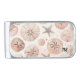 Enjoy the feeling of a warm tropical destination with beach vibes on your mind, this money clip boasts various sand dollars in soft blush and taupe colors, reminiscent of beach days. Customize with your initials as desired.