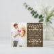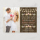 Add your favorite engagement photo or picture to this rustic string of lights save the date postcard that is part of a fall floral rustic string of lights wedding invitation set in blush, coral, green, brown, white, yellow and brown hues with a beautiful wood look background reminiscent of a wooden fence and or barrel. An autumnal laurel wreath composed of acorns, berries, sunflowers, tulip rose and white blossoms sit on a leafy branch. The words Save the Date is flanked by two coral hearts. Perfect accompaniment for an outdoor fall, country, farmhouse, barnyard or rural chic themed wedding. Add a special message for your guests on the antique vintage parchment look background on the back of the std. The charming twinkle and fairy lights with a bokeh effect look bright, warm and inviting. Artwork © Chrissy H. Studios, LLC. All rights reserved.