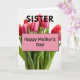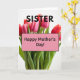 This card shows a lush bouquet of tulips filling the center, with closed petals shaded from soft blush pink to deep rosy red, like a gentle blush shared between close family ❤️. Tall green stems and pointed leaves rise neatly beneath the blooms, giving the arrangement a fresh, growing feel. The background is plain white with soft, diffused lighting that makes the flowers look softly glowing rather than harshly lit. At the top, the word “SISTER” sits in large, dark letters, clearly separated from the flowers so it stands out right away. Near the middle, a rose-colored rectangular panel with a thin darker outline rests over the bouquet, as if placed carefully like a note tucked into the stems. Inside that panel, “Happy Mother’s Day!” appears in dark, easy-to-read lettering, centered and balanced. The petals show fine curved edges and gentle color blending, while the leaves display faint veins and crisp tips 🌼.