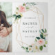 This all in one tri-fold wedding invitation card features painted watercolor flowers in blush pink, white and green foliage with a gold geometric frame, add wedding details, rsvp, and your photo. For more advanced customization of this design, please click the "customize further" link. Matching items are also available.