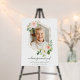 Elegant funeral welcome sign features painted watercolor flowers in blush pink, white and green foliage with a hexagon gold frame. For more advanced customization of this design, please click the BLUE DESIGN TOOL BUTTON.