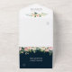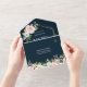 This all in one wedding invitation card features a gold hexagon frame decorated with painted watercolor flowers in blush pink, white and green foliage on a navy blue background, a wedding invite with an rsvp postcard for your guests to cut off and send back. For more advanced customization of this design, please click the "customize further" link. Matching items are also available.
