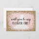 Rose gold glitter with blush background and our drawn mermaid wedding gown. Says "will you be my flower girl?"