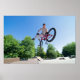 Bmx rider performing a tail whip at a quater pipe ramp on a skatepark.