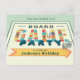 Board Game Party Postcard Invitation featuring a fun typography of "Board Game Party''. This designs include elements of blue, yellow, red and orange, a game board background, dice, game pieces, game cards, and elements inspired by board games. Products include a template for personal customization.