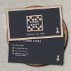 A business card for a board games store. The design includes a game board with minimalist black and beige checkered squares, and an elegantly designed pawn sits in the bottom right corner. It could be used by a creator or store of board games, construction or educational games, strategy or role-playing game, etc.