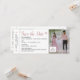 Boarding Pass Plane Ticket Save the Date Invitation Announcement for a Destination Wedding Abroad that has an editable template with room for a photo and authentic retro details like a bar code and computer printer font with rose gold blush pink accents and romantic airplane icon.