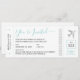 An invitation that looks like a boarding pass plane ticket card with a simple modern romantic airplane logo and elegant script fonts in turquoise aqua blue and silver, perfect for a destination wedding that guests will be traveling to, a wedding abroad, or for a travel theme wedding for a couple who has major wanderlust and a sense of adventure or who met while traveling or working internationally.