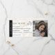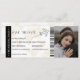 Modern minimalist monogram boarding pass wedding ticket with a simple white and brown background, a photo of the engaged couple, a plane with a loop trail, and a personalized save the date template that is easy to personalize. Don't forget to update the monogram text on the back.