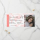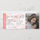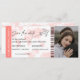Modern monogram boarding pass wedding ticket with a simple white and salmon background, a photo of the engaged couple, a plane with a loop trail, and a personalized save the date template that is easy to personalize. Don't forget to update the monogram text on the back.