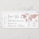Rose gold world map destination wedding save the date that looks like a boarding pass plane ticket with a romantic airplane travel logo on the back. All details can be edited for any type of party or wedding location abroad. The pink and gray color scheme is perfect for a modern and trendy romantic travel theme.