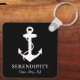 A chic modern nautical-themed keychain for your boat featuring a white anchor on a black background. Personalize your boat's name and location in elegant white typography and script.
