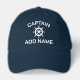 Navy blue boat captain hat with ship wheel logo and custom name. Modern typography template for sailor. Make your own personalized cap for sailing / boating. White ship anchor symbol with text template. Cool Birthday or Father's Day gift idea for men. Make your own for dad, uncle, father, brother, husband, grandpa, boss, fisher, friend, bosun, deckhand etc. Custom color caps with straps and buttons.