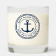 Scented candle featuring a dark blue, elegant anchor and rope emblem with custom boat name and hailing port (or other custom text) on a clear background.