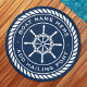 Round beach towel featuring a white, elegant ship's wheel and rope emblem with custom boat name and hailing port (or other custom text) on a dark blue background.