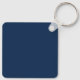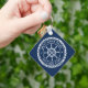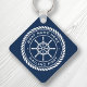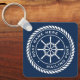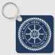 Keychain featuring a white, elegant ship's wheel and rope emblem with custom boat name and hailing port (or other custom text) on a dark blue background.