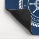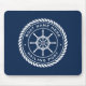 Mousepad featuring a white, elegant ship's wheel and rope emblem with custom boat name and hailing port (or other custom text) on a dark blue background.