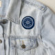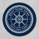 Patch featuring a white, elegant ship's wheel and rope emblem with custom boat name and hailing port (or other custom text) on a dark blue background. Available with adhesive, iron-on and velcro backing.