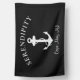 A modern nautical-themed black flag for your boat that features an illustration of a white anchor. Personalize your boat's name and location in elegant white typography and script.