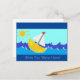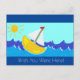 Digital illustration of a yellow boat on an ocean wave. The yacht has white sails and a red flag. The yellow sun shines down. Message reads 'Wish You Were Here!' Easily personalise this card by editing the template text. Thanks for viewing my designs.