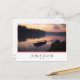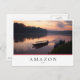 Photo postcard with a boat on the Tambopata river in the Amazon rainforest in eastern Peru near the Brazilian border during a pink sunrise with the text 'Amazon, Peru' in a white box and with stripes in red, white and red, the colors of the peruvian flag.