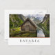 Postcard of a wooden boathouse cabin inside Obersee lake surrounded by beautiful high Alps mountains in a Bavaria landscape in the south eastern tip of Germany, near the border with Austria with a white edge and in a white box the text 'Bavaria, Germany'. It comes with stripes in black, red and yellow, the colors of the German flag.
