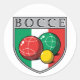 This colorful Bocce graphic features three Bocce balls in a shield over the Italian flag of green, white and red with the word Bocce.