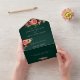 Beautiful watercolor bohemian floral arrangements with feathers, foliage, and colorful flowers, all in one wedding invitation in emerald green color. Template provides space to personalize each invitation with your guest name(s) and address.