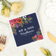 Navy blue cocktail napkins for a wedding with colorful floral arrangements in orange, coral, hot pink, blue, and olive green. Mr & Mrs in modern white fonts. Your last name in a pretty white script. Add your wedding date too!