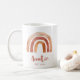 This ceramic mug has the word "auntie" written in a handwritten brush script above a bohemian burnt orange terracotta rainbow with a sun inside. This coffee cup is a wonderful gift for your favorite aunt and the ideal way to welcome a new baby into the family.