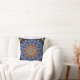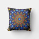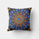Throw pillow with a bohemian style design in colors of blue against a black background.