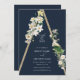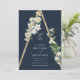 A beautiful bohemian style rustic wood pyramid with white watercolor florals cascading on the side and a blue background. A unique design that uses vintage white watercolor botanicals on a bohemian triangle structure. A charming white floral design with rustic and geometric features and elegant script typography. An elegant wedding save the date card design with modern elements. Matching wedding invitations and other stationery items are also available.