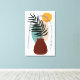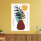 Add a touch of nature-inspired beauty to your home decor with this stunning abstract landscape print. This Scandinavian, mid-century, boho-style print features the stylization of a terracotta pot with a plant in it, placed near a stylized window through which the sun and some clouds can be seen. The unique and elegant design, combined with the warm color palette, creates a beautiful and eye-catching addition to any room.