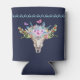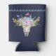 Can cooler on a dark blue background with a boho chic animal skull with a floral bouquet upon its head and little butterflies fluttering about. A cute decorative border with little teardrop shapes in light blue.