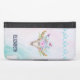 A personalized phone wallet case with a turquoise and pastel watercolor background. A boho chic animal skull with a floral bouquet upon its head and little butterflies fluttering about. A cute decorative border with little teardrop shapes in light blue.