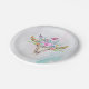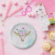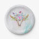 Party paper plates with a turquoise and pastel watercolor background. A boho chic animal skull with a floral bouquet upon its head and little butterflies fluttering about.