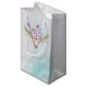 A gift bag with a turquoise and pastel watercolor background. A boho chic animal skull with a floral bouquet upon its head and little butterflies fluttering about.