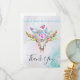 A party thank you card, flat style designed with a turquoise and pastel watercolor background. A boho chic animal skull with a floral bouquet upon its head and little butterflies fluttering about. A cute decorative border with little teardrop shapes in light blue. Personalized message on the back.