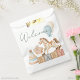 A welcome message for a white paper favor bag with a baby-themed, watercolor-style design. The front features a rocking horse, a stack of baby socks, a stacking ring toy, and a pair of balloons.