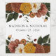 Rustic, personalized wedding wine labels featuring your names and wedding date centered bordered by bouquets of watercolor flowers and greenery in muted autumnal colors of ivory, orange, mustard gold, olive green, dusty rose, and brown. The autumn floral wine labels were designed to coordinate with our Boho Autumn Floral wedding collection.