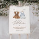 Welcome friends and family to the big reveal with this boho welcome sign, featuring watercolor baby clothes and elegant typography.