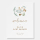 Celebrate the mom-to-be with this adorable gender neutral baby shower welcome sign featuring a cute watercolor illustration of baby’s first outfit, wooden toys and eucalyptus leaves.