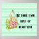 Boho style tribal pattern background, open sacred geometry terrarium, colorful succulents and bold text that reads "Be Your Own Kind of Beautiful"