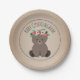 Baby shower paper plates featuring an illustration of a baby bear cub wearing a flower crown. Background is card stock inspired. Personalize the name.