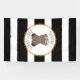 A baby shower banner featuring an illustration of a baby bear wearing a flower crown over a black and white stripe background. Personalize the text.