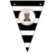 Baby Shower Bunting featuring an illustration of a baby bear cub wearing a flower crown. Background is black and white stripe pattern. Personalize the name.