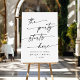 The quote on your welcome wedding sign reads "the party starts here". Customize it with the names of the couple and the date.