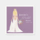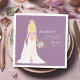 This boho-themed paper napkin features a graceful curtain of pearls and a stunning boho bride with blonde hair in a delicate lace wedding dress. Adorned with a lush bouquet of roses, pampas grass, eucalyptus, and ranunculus.